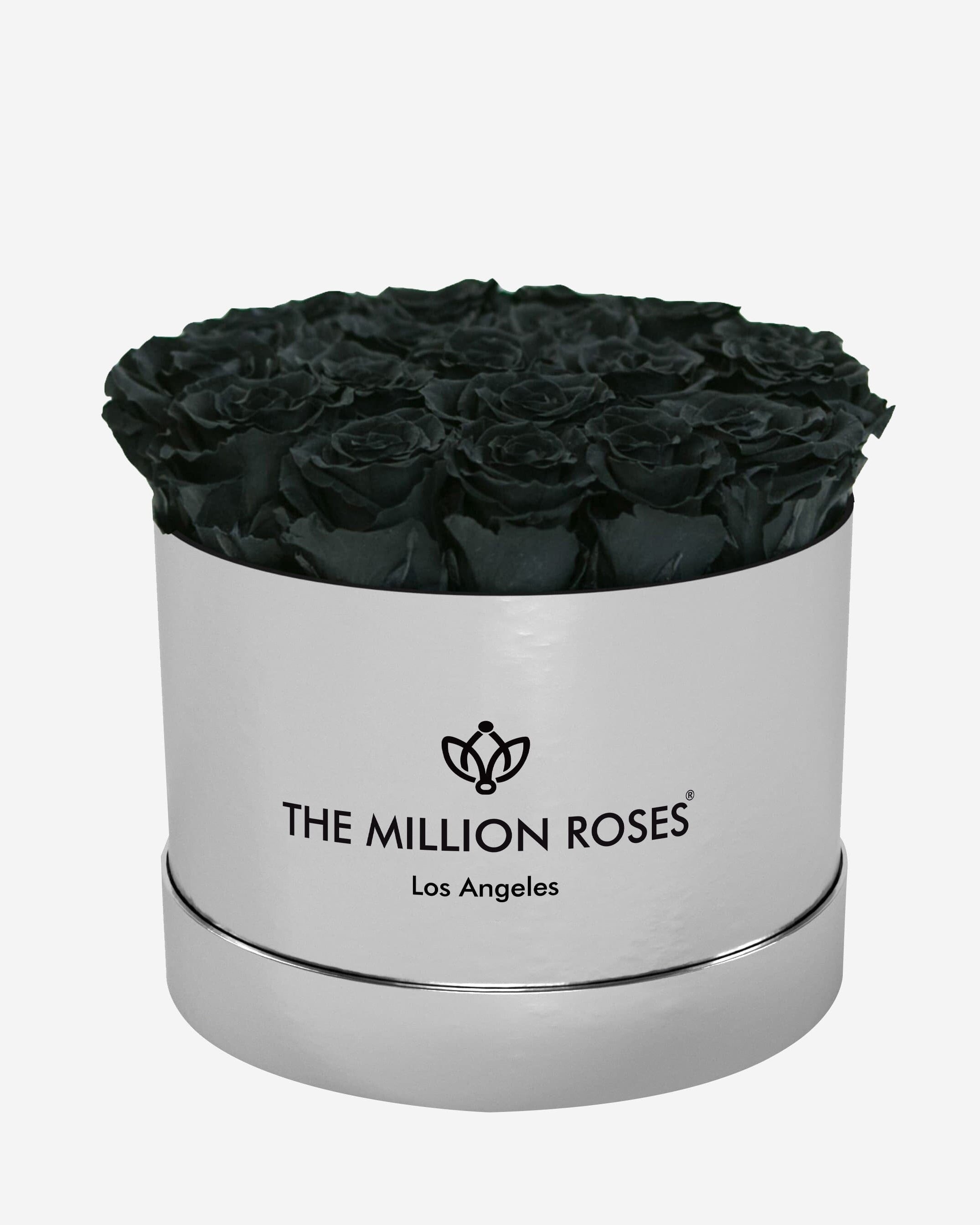 Our Classic collection embodies this stylish simplicity in a mirror silver box filled with black long-lasting roses.